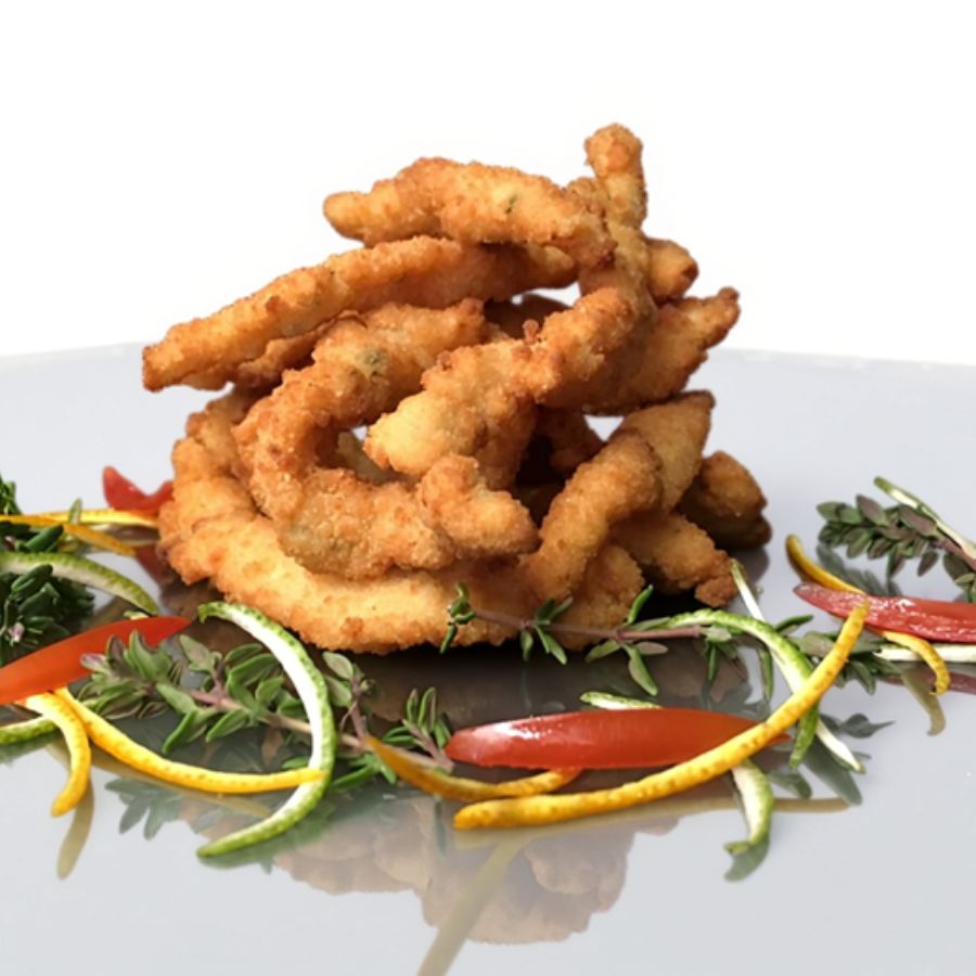 Tires de pit de pollastre tallades a mà macerades amb llimona, all i espècies i cobertes d’un cruixent empanat. El plat ideal per servir en menjars informals, un plat perfecte per a nens i de fàcil regeneració. Se serveix en caixa de 2 kg.